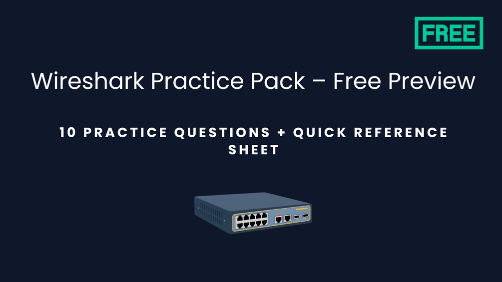 Free pack with 10 practice questions and a quick reference sheet of Wireshark filters and shortcuts. Perfect for IT and networking beginners.